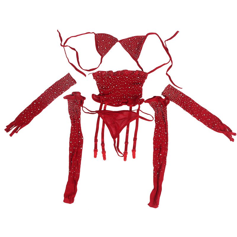 952181 bodystocking de rejilla con guantes y diamantes rojo talla única
